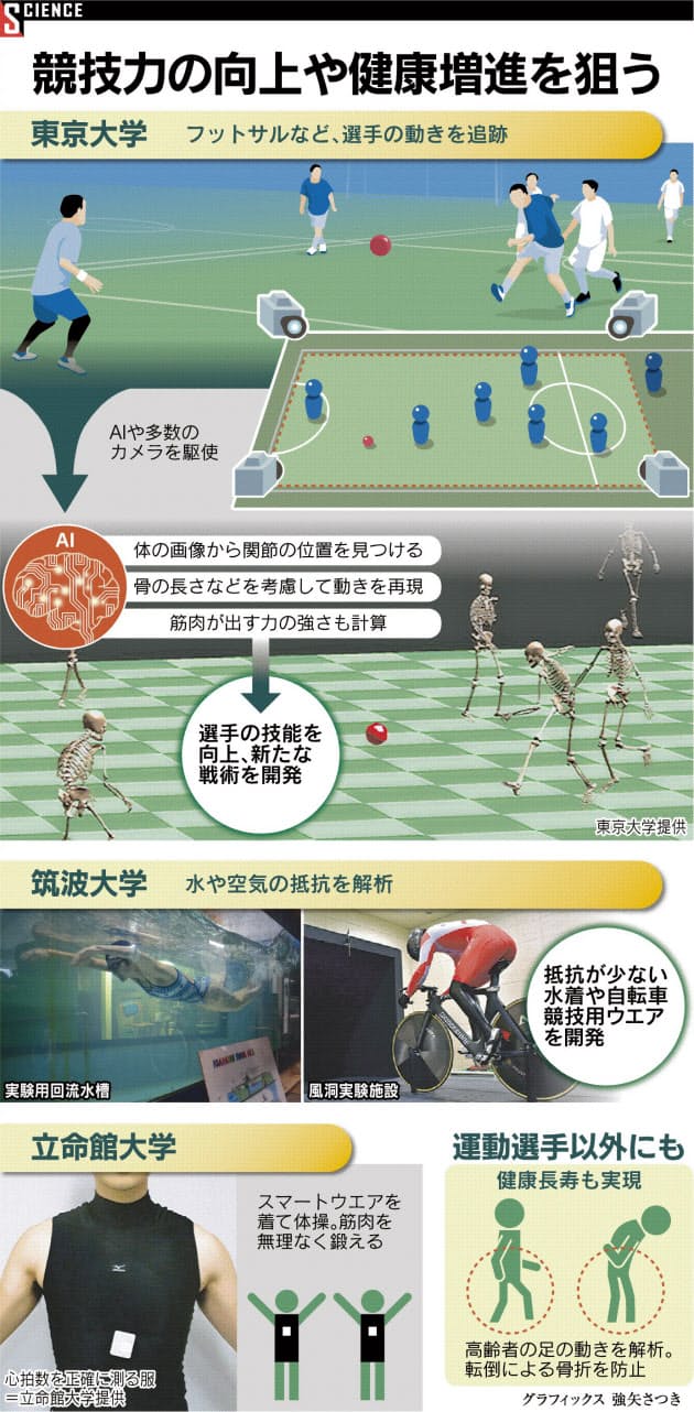 「スポーツ科学」を冠にした研究拠点が主要な大学に相次いで誕生し活動が広がっている。トップアスリートたちと協力して優れた競技能力を調べ、他の選手にも参考となり、成績をより高める練習法の改善などに役立てる。スポーツウエアを開発するなど産学連携も進む。一般市民の健康増進につながる研究成果も生まれると期待されている。