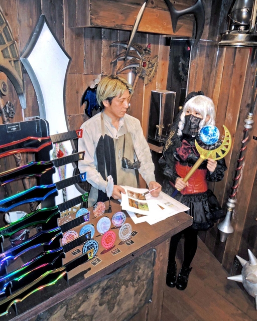 同社スタッフが考案した武器と衣装のセットを22組展示。副代表でコスプレイヤーの桃井鈴さん(30)がモデルとなった写真を添え、それぞれの世界観を演出する。2.4メートル四方のボードで背景を作り込んだ魔方陣などのフォトスポットもある。制作過程が分かる資料、制作現場の写真やミニチュアも展示。「ものづくりの現場を知ってほしい」と折井さん。
